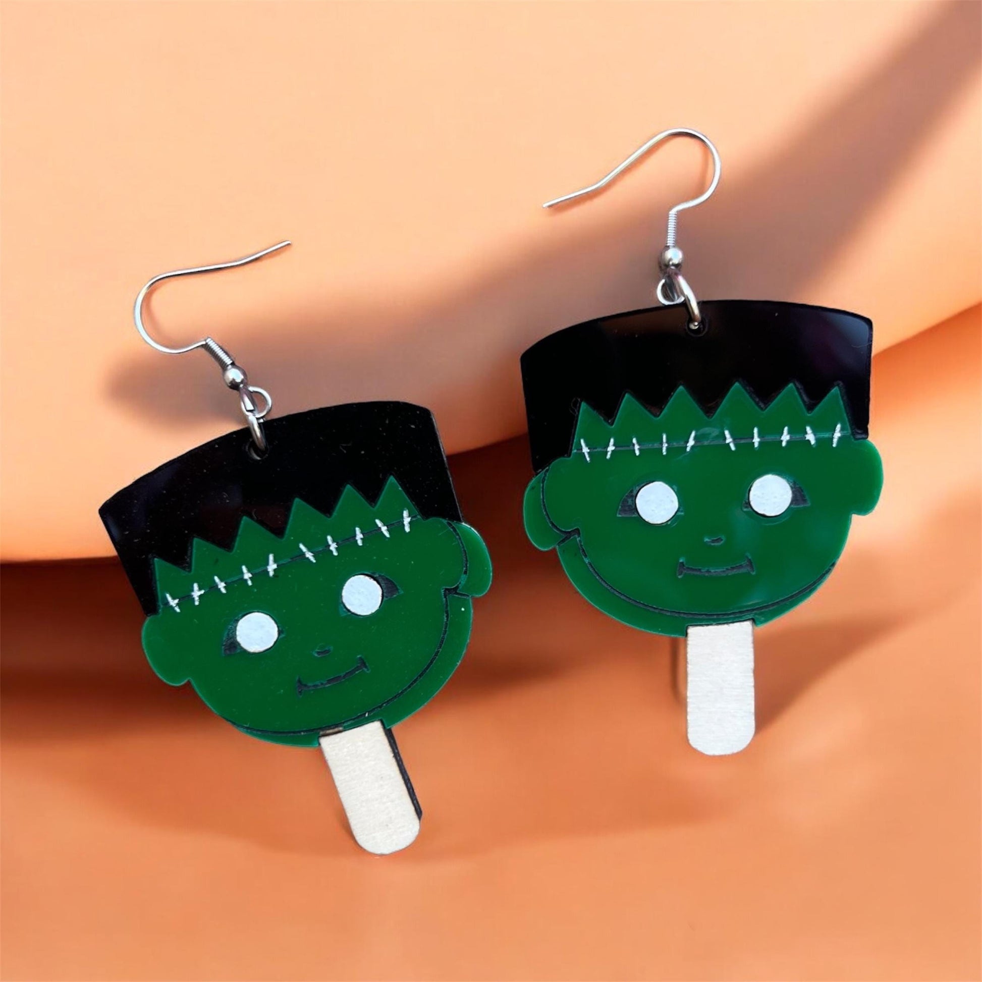 Take a bite out of these fun Frankenstein popsicle earrings, made with wood, acrylic, and stainless silver hardware. Perfect for any spooky season outfit!