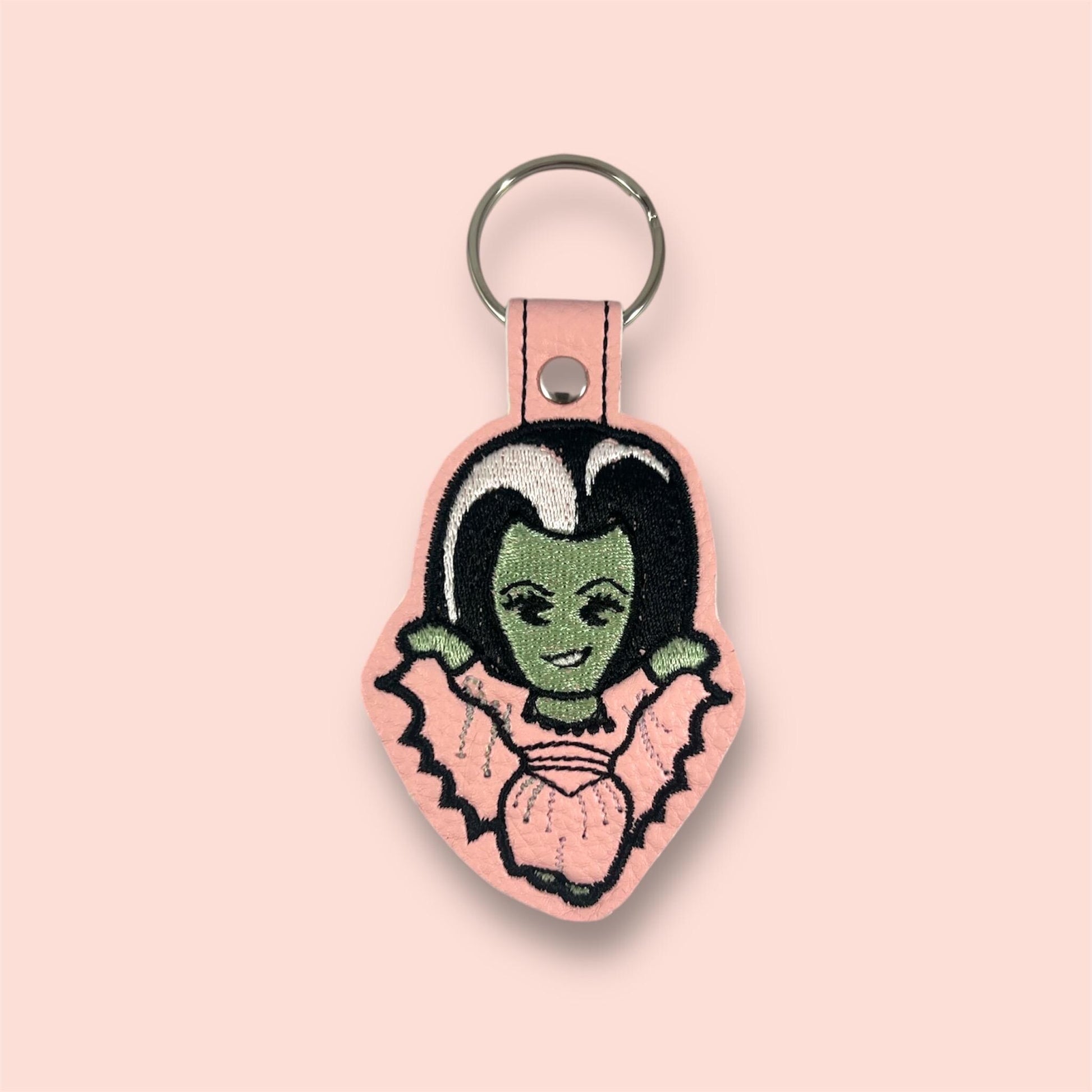 Add a touch of vintage charm to your keys or bag with this delightful embroidered Lily Munster keychain! Measuring approximately 3” from top to bottom, this unique accessory features intricate embroidery that captures the iconic style of Lily Munster.
